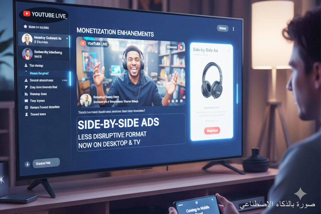 هناك أيضاً الميزات الجديدة الهادفة إلى دعم نمو القنوات وتوسيع فرص تحقيق الأرباح، بالاعتماد على الذكاء الاصطناعي وتقنيات الإبداع الحديثة. وعزّز يوتيوب تجربة البث المباشر بميزات مرنة تتيح تفاعلًا أكبر ومصادر دخل جديدة من خلال تقديم بث مزدوج التنسيق، البث أفقيًا ورأسيًا في نفس الوقت مع توحيد تجربة الدردشة. هناك أيضا ميزةالتلخيص للبث المباشر: تحليل البث واستخراج أبرز اللقطات تلقائيًا لإنشاء فيديوهات Shorts جاهزة. كما وسع يوتيوب نطاق تحقيق الدخل بطرق مبتكرة تستهدف البث المباشر والتسويق التجاري مثل الإعلانات المتجاورة وهي تنسيق إعلاني غير مزعج يظهر بجانب البث، متاح الآن على الحواسيب والتلفزيونات، وقريبًا على الهواتف. كما أصبح هناك ميزة الانتقال إلى بث الأعضاء أثناء البث الحي، وهي ميزة جديدة تتيح التحويل من بث عام إلى بث حصري للأعضاء لتشجيع الاشتراكات. هناك الطوابع الزمنية التلقائي، من خلال ربط لحظات ظهور المنتجات بعلامات محددة داخل الفيديو لزيادة فرص التسويق. أدوات البودكاست طور يوتيوب أدوات خاصة لمبدعي البودكاست تمكّنهم من تحويل محتواهم إلى فيديوهات قابلة للمشاركة بسهولة: من خلال تحويل الحلقات إلى فيديوهات قصيرة، مع اقتراحات ذكاء اصطناعي لاختيار المقاطع الأنسب، وتوسيع الميزة لمنشئي المحتوى في الولايات المتحدة مطلع العام القادم.