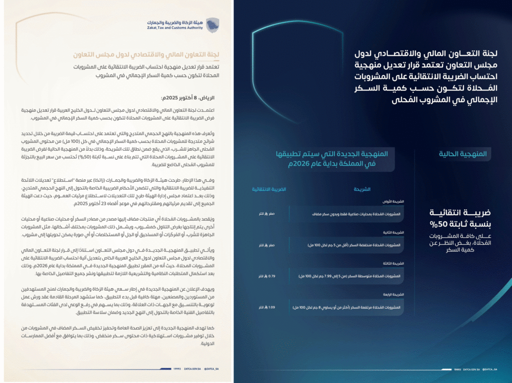 وذكر بيان هيئة الضريبة والذكاة والجمارك في السعودية أن لجنة التعاون المالي والاقتصادي لدول مجلس التعاون لدول الخليج العربية اعتمدت قرار تعديل منهجية فرض الضريبة الانتقائية على المشروبات المحلاة لتكون بحسب كمية السكر الإجمالي في المشروب. وتُعرف هذه المنهجية بالنهج الحجمي المتدرج والتي تعتمد على احتساب قيمة الضريبة من خلال تحديد شرائح متدرجة للمشروبات المُحلاة بحسب كمية السكر الإجمالي في كل (100 مل) من محتوى المشروب المُحلى الجاهز للشرب الذي يقع ضمن نطاق تلك الشريحة، وذلك بدلاً من المنهجية الحالية لفرض الضريبة الانتقائية على المشروبات المحلاة التي تتم بناءً على نسبة ثابتة (50%) تُحتسب من سعر البيع بالتجزئة للمشروب المُحلى الخاضع للضريبة بحسب البيان. وفي هذا الإطار، طرحت هيئة الزكاة والضريبة والجمارك (زاتكا) عبر منصة “استطلاع” تعديلات اللائحة التنفيذية للضريبة الانتقائية والتي تتضمن الأحكام الضريبية الخاصة بالتحول إلى النهج الحجمي المتدرج، وذلك بعد اعتماد مجلس إدارة الهيئة طرح تلك التعديلات لاستطلاع مرئيات العموم، حيث دعت الهيئة الجميع إلى تقديم مرئياتهم ومقترحاتهم في موعدٍ أقصاه (23 أكتوبر 2025م). ويُقصد بالمشروبات المُحلاة أي منتجات مضاف إليها مصدر من مصادر السكر أو محليات صناعية أو محليات أخرى يتم إنتاجها بغرض التناول كمشروب، ويشمل ذلك المشروبات بمختلف أشكالها، مثل المشروبات الجاهزة للشُرب، أو المُركّزات أو المساحيق أو الجل أو المستخلصات أو أي صورة يمكن تحويلها إلى مشروب. ويأتي تطبيق المنهجية الجديدة في دول مجلس التعاون استنادًا إلى قرار لجنة التعاون المالي والاقتصادي لدول مجلس التعاون لدول الخليج العربية الخاص بتعديل آلية احتساب الضريبة الانتقائية على المشروبات المُحلاة، حيث أنه من المقرر تطبيق المنهجية الجديدة في المملكة بداية عام 2026م، وذلك بعد استكمال المتطلبات النظامية والتشريعية اللازمة لتطبيقها ونشر جميع التفاصيل الخاصة بها. ويهدف الإعلان عن المنهجية الجديدة في إطار سعي هيئة الزكاة والضريبة والجمارك لمنح المستهدفين من المستوردين والمصنعين، مهلة كافية قبل بدء التطبيق، كما ستشهد المرحلة القادمة عقد ورش عمل توعوية بالتنسيق مع الجهات ذات العلاقة، وذلك بما يسهم في رفع الوعي لدى الفئات المستهدفة بالتفاصيل الفنية الخاصة بالتحول إلى النهج الجديد وضمان سلاسة التطبيق. كما تهدف المنهجية الجديدة إلى تعزيز الصحة العامة وتحفيز تخفيض السكر المضاف في المشروبات من خلال توفير مشروبات استهلاكية ذات محتوى سكر منخفض، وذلك بما يتوافق مع أفضل الممارسات الدولية.