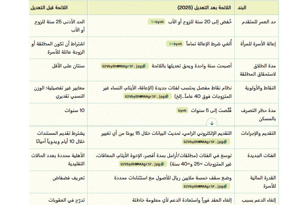 - التوسع في الفئات المخولة بالتقديم (الأرامل، المطلقات، الأيتام، ذوو الإعاقة، الإخوة الأيتام، النساء فوق 25 عاماً دون زواج).