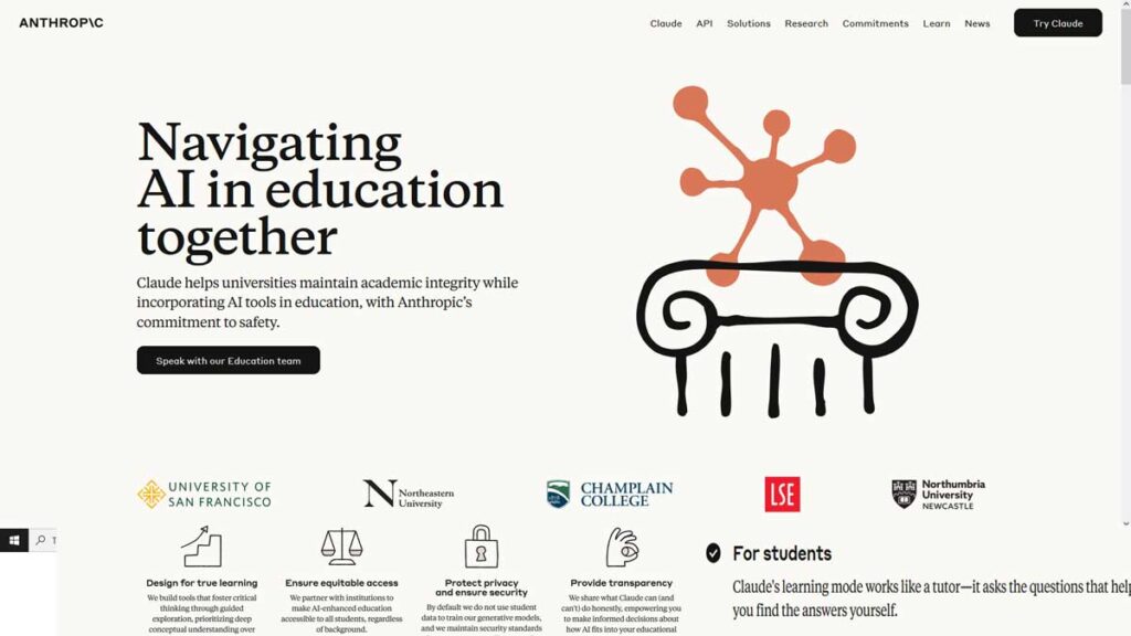 أما أنثروبك، التي تقدم تطبيق كلاود، فهي تعمل أيضا لتطوير أداة جديدة باسم مشاريع دراسية توضح فيها خطوات لتعليم الطلاب سبل التفكير لحل المسائل وتقديم الإجابات في المواد الدراسية. و ستقدم هذه تصوّيراً للمفاهيم الرئيسية بمخططات وصور توضيحية للمقاهيم المعقدة، وبناء أدلة دراسية شاملة، تقدم توجيهات بحسب احتياجات الطالب التعليمية. وأصدرت أنثروبيك نسخةً مُركزةً على التعليم من مساعدها الذكي “كلود للتعليم: ” (Clude AI)، المُصمم خصيصًا للكليات والجامعات ومسؤوليها. ومن أبرز ما تشمله من ميزات هناك “وضع تعلم” جديد يُعزز طرح الأسئلة السقراطية وهي طريقة تدريس تعتمد على طرح الأسئلة لتشجيع التفكير النقدي وحل المشكلات لتساعد على بناء مهارات التفكير النقدي، بدلًا من مجرد تقديم الإجابات. كما توفر أدواتٌ لأعضاء هيئة التدريس لإنشاء المناهج الدراسية والواجبات وأطر التقييم، ولمسؤولي الجامعات لأتمتة المهام الشائعة. وتزعم أنها توفر الأمان والخصوصية لتلبية معايير الامتثال التعليمي – وأنها لا تُستخدم بيانات الطلاب لتدريب النماذج. وتتعاون أنثروبيك مع مُزودي أنظمة إدارة التعلم مثل Instructure (Canvas)، وقد وقّعت اتفاقياتٍ على مستوى الحرم الجامعي مع مؤسساتٍ مثل جامعة نورث إيسترن وكلية لندن للاقتصاد، مما يجعل “كلود” مُتاحًا لجميع الطلاب والموظفين.