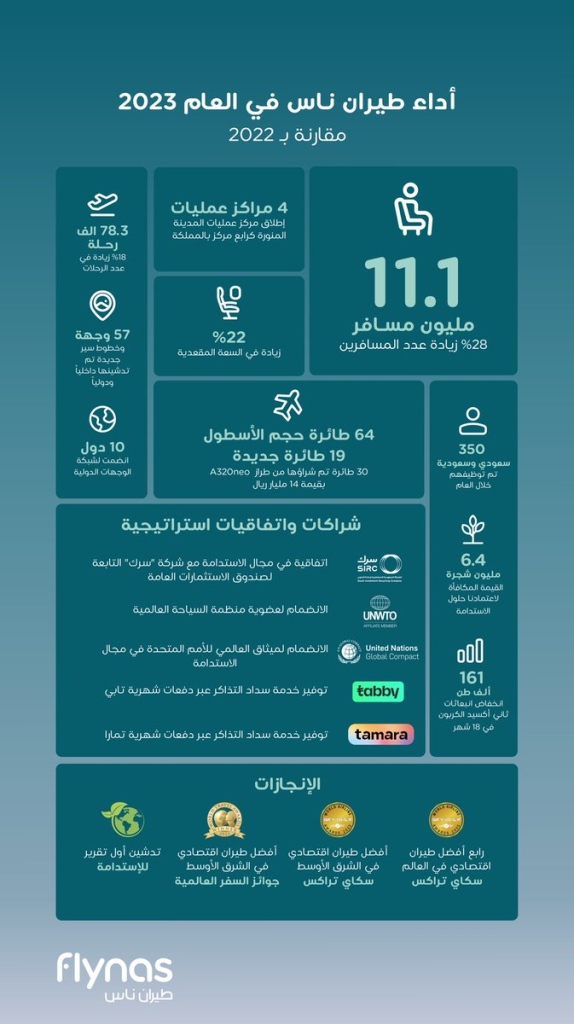 أعلنت شركة “طيران ناس” السعودية، أنها نقلت أكثر من 11.1 مليون مسافر خلال 2023، لتحقق بذلك نتائج قياسية غير مسبوقة وتسجل ارتفاعاً تاريخياً على أساس سنوي بنسبة نمو تجاوزت 28% بالمقارنة مع 2022.