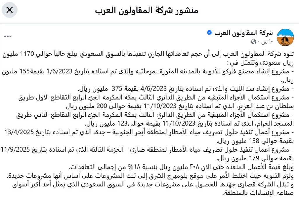 نفت شركة المقاولون العرب المصرية فوزها، حديثاً، بثلاثة مشاريع بنية تحتية كبرى في المملكة العربية السعودية موضحة أن التعاقدات المذكورة هي مشاريع قيد التنفيذ حالياً (جارية) وليست مستجدة.