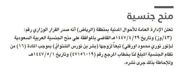 تعلن الإدارة العامة للأحوال المدنية بمنطقة (الرياض) أنه صدر القرار الوزاري رقم: (٤٣/وز) وتاريخ ١٤٤٧/٤/٢٩ هـ القاضي بالموافقة على منح الجنسية العربية السعودية لـ (نور نوري محمود أورفلي) تبعاً لزوجها (بشر بن نورس الشنواني) بموجب المادة (١٦) من نظام الجنسية المبلغ لنا بالخطاب المرجع رقم (٤٧١٥٦٠١٩) وتاريخ ١٤٤٧/٥/١ (23/10/2025) وللإحاطة بذلك جرى نشره”.
